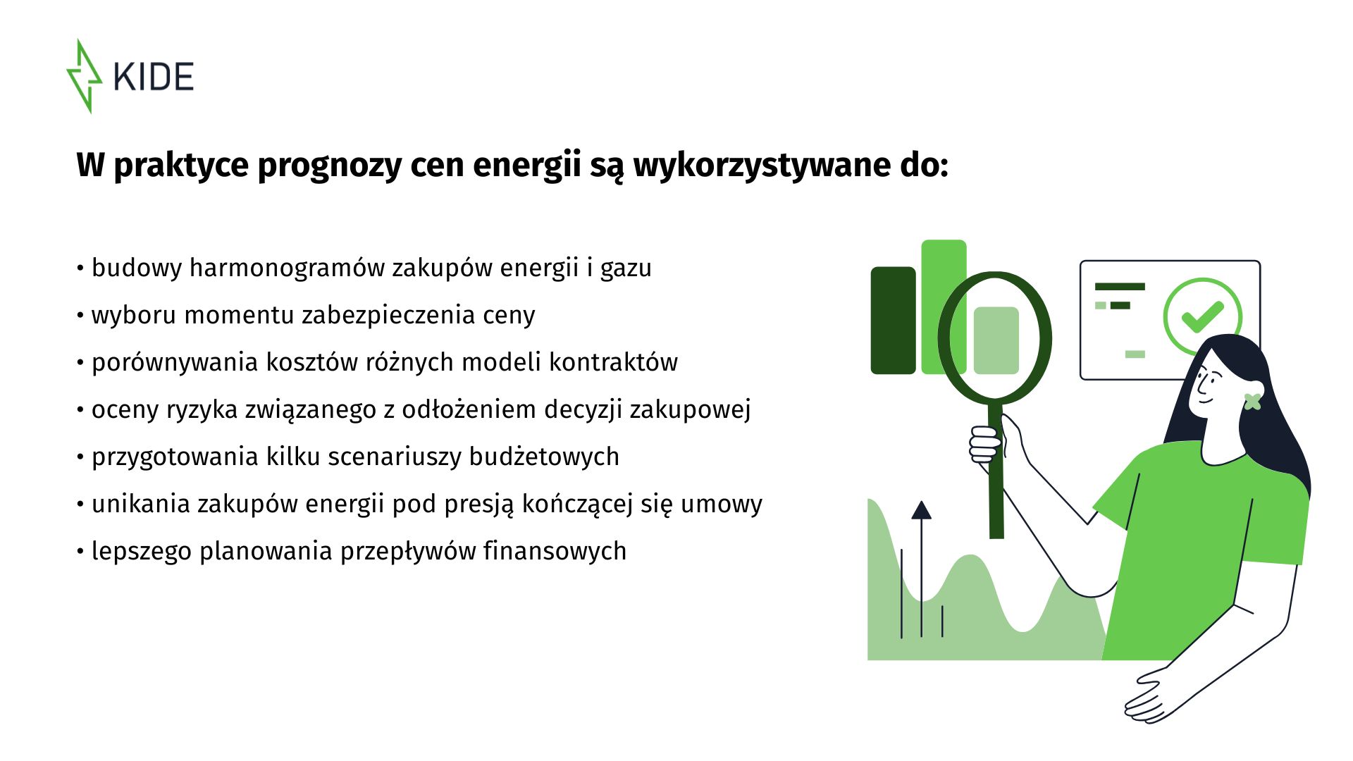W KIDE obserwujemy rosnące zainteresowanie analityką rynkową. Firmy chcą wiedzieć, nie tylko ile zapłacą dziś, ale co może wydarzyć się jutro. Monitoring rynku oraz prognozy cen energii pozwalają lepiej rozumieć rynek i ograniczać ryzyko kosztowe. W rezultacie decyzje zakupowe stają się bardziej świadome, eliminują błędy oraz zmniejszają ryzyko decyzyjne.